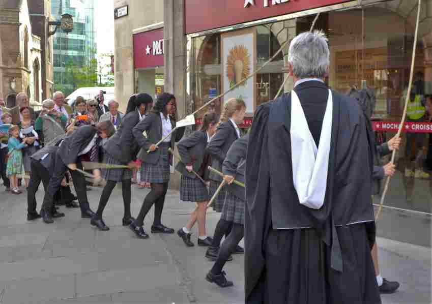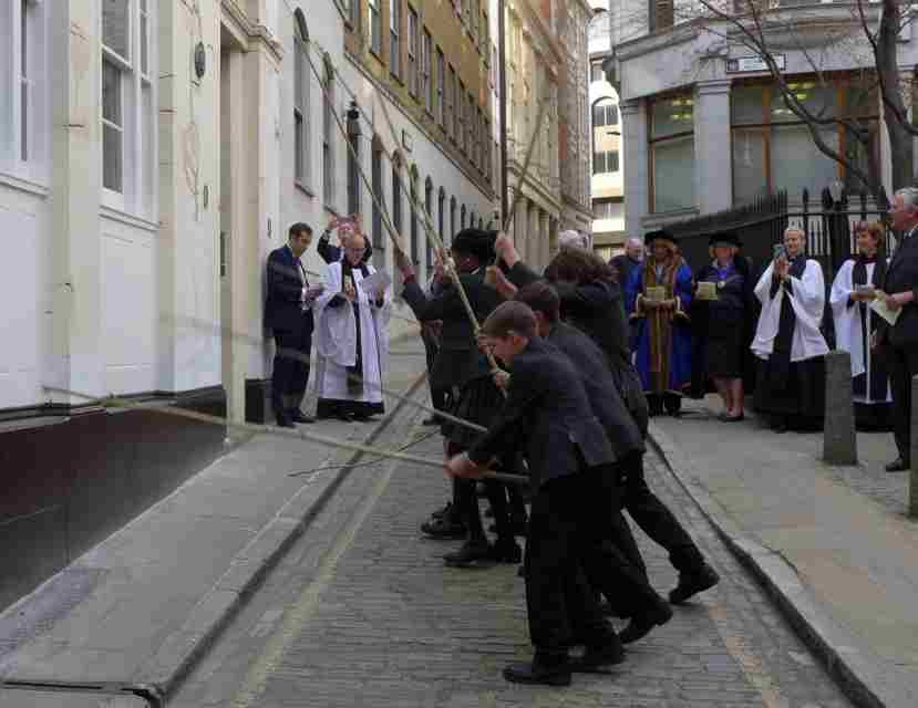 Led by the Vicar, the Reverend Bertrand Olivier, the Beating Party of students from St. Dunstan’s College proceeded to strike the pavements and steps of selected surrounding streets (and even the midst of the River Thames from the relative safety of a motor launch) with willow and hazel staves. By the time the procession returned to church for the much-needed tea, the parishioners (plus startled tourists, commuters, and the staff of Pret-a-Manger) were in no doubt as to the extent of All Hallows’ parochial bounds.