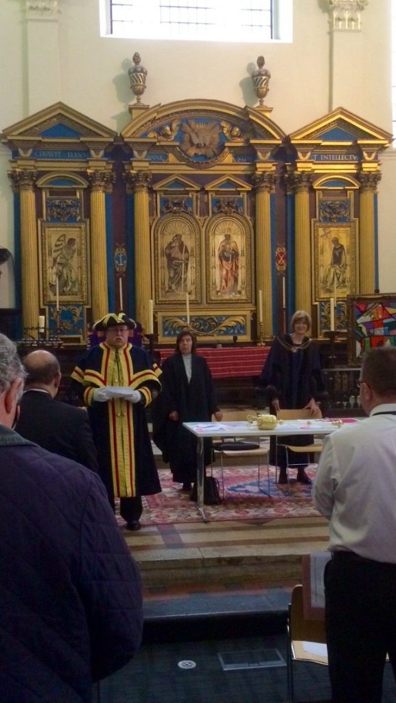 The 2017 Wardmote in Candlewick was a colourful affair, presided over by the Ward’s Alderman Dame Fiona Woolf DBE DL at the Church of St Clement Eastcheap on Wednesday 22nd March. The Wardmote is an ancient custom, of pre-Conquest origin, and is a formal meeting of candidates, electoral officers and constituents. The Guild was represented by the Clerk. As part of the formalities, Mr Bill Bateman, splendidly attired in his gold-trimmed coat and cape, was re-elected as Ward Beadle, and Miss Sheila Robinson was re-appointed as Hon Ward Clerk.