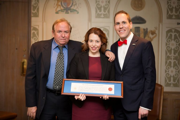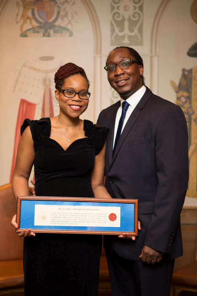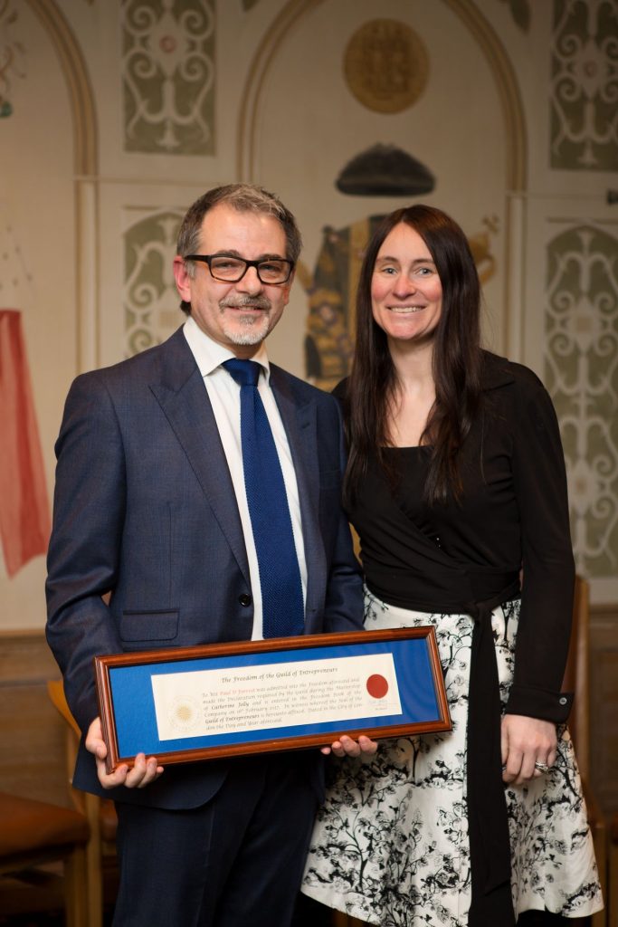 Freeman Dr Sarah Malter with guests (L-R) Mr Martin Malter and Mr Dan Metcalfe