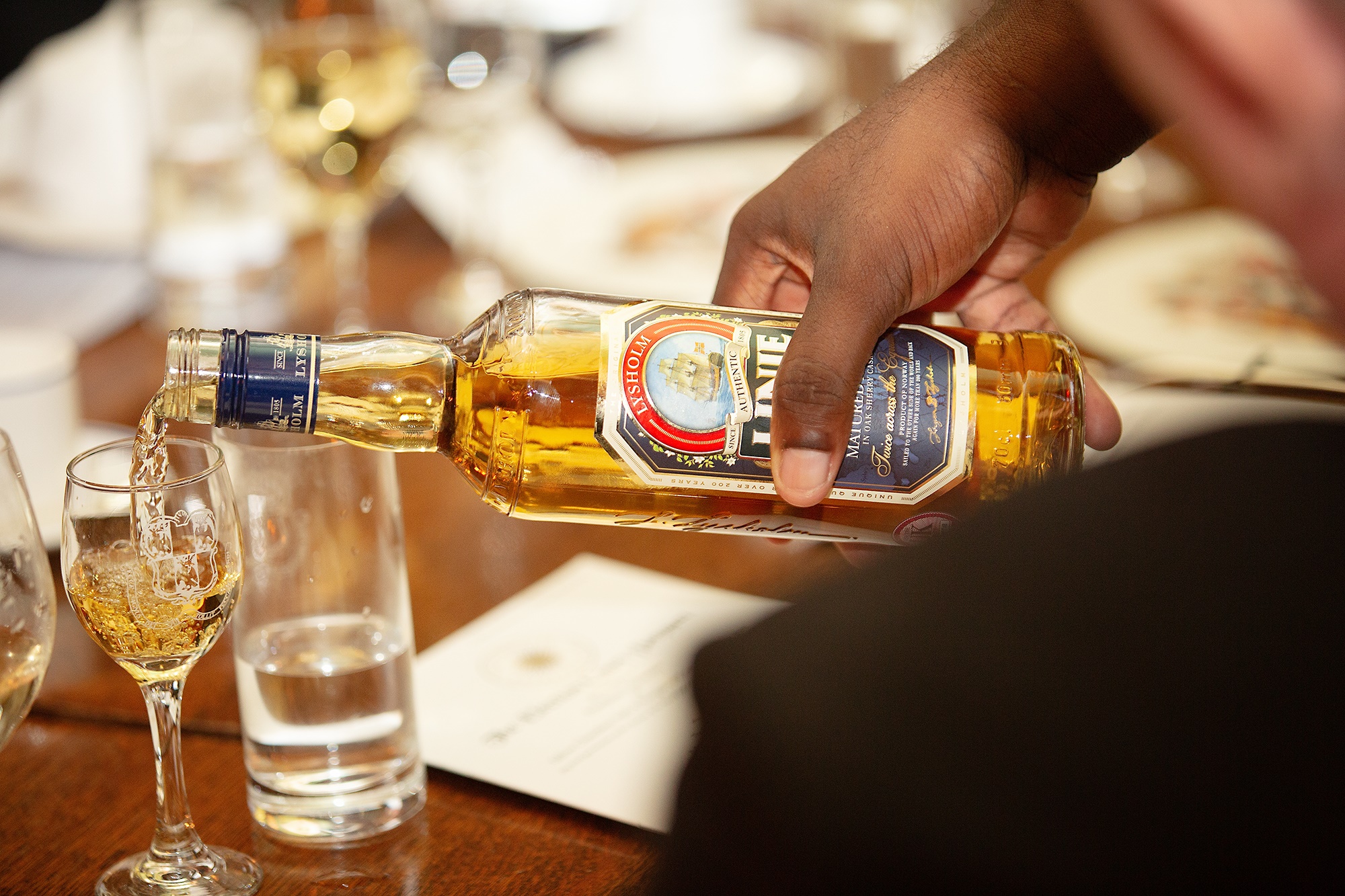 Presenting an homage to his Nordic ancestry, the Master had chosen Norwegian salmon – generously portioned and exquisitely prepared – followed by rømmegrøt (a wheat pudding, prepared with soured cream and butter) – served not with traditional cured meats, but with a tangy compote of summer berries. The theme continued with the serving of akevitt – a Norwegian spirit, about which the Master spoke to explain its unique maturation process at sea. Opinion appeared divided over the appropriate rate of consumption of this drink, but, reassured by the Master, all stood to toast in Norwegian, and as many politely sipped as eagerly gulped!