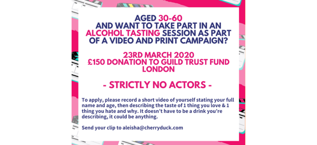 Cherryduck Productions, owned by Guild Freeman James Vellacott is looking for alcohol (Whisky) tasters… no connoisseurs, to attend an on location shoot, somewhere in London, for a print and social media campaign. You may like alcohol or you may not, it doesn’t really matter.